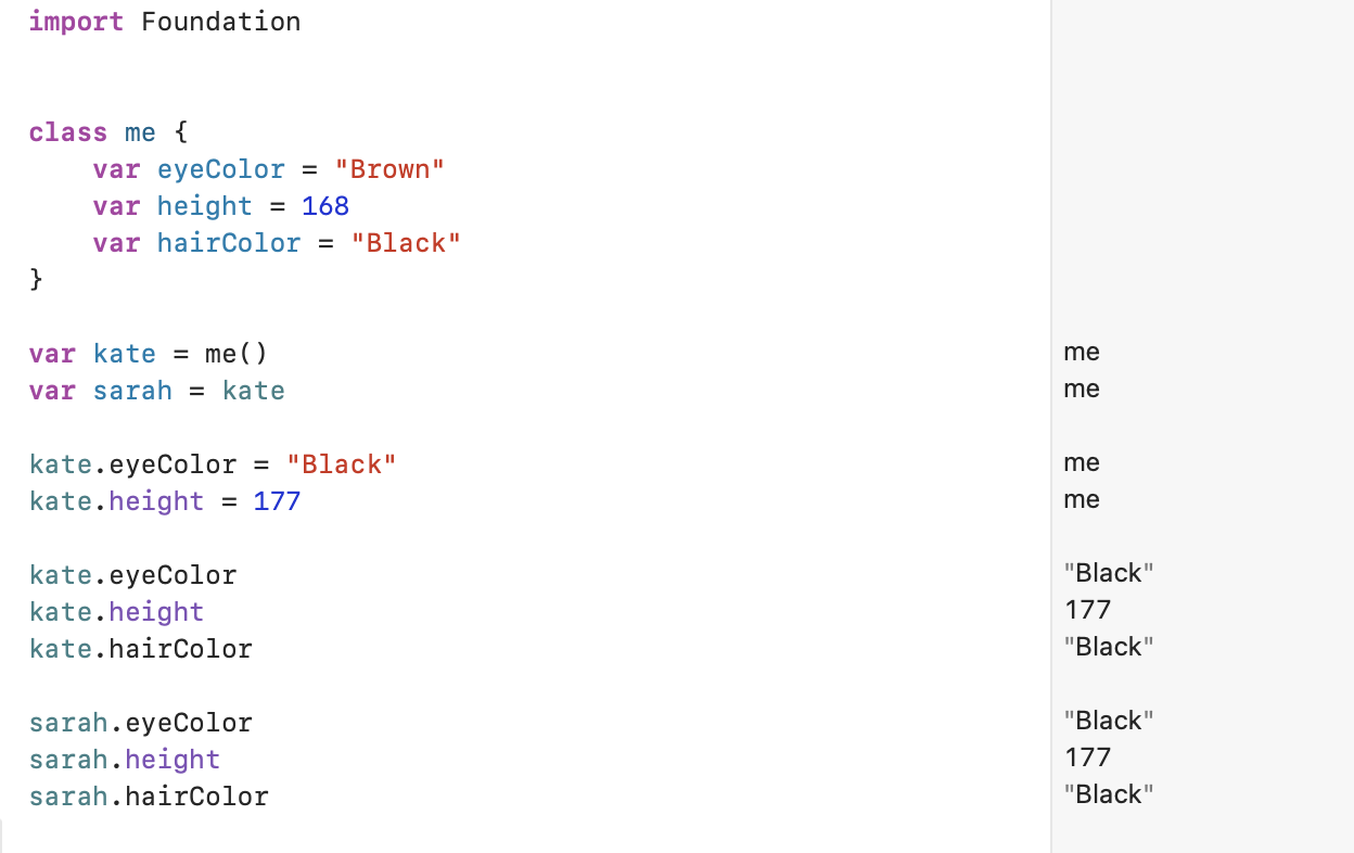 Struct์ ๊ฒฝ์ฐ Class ์ ๋ฌ๋ฆฌ, ๋ฉ๋ชจ๋ฆฌ๋ฅผ ๋ ๋ฆฝ์ ์ผ๋ก ์ฌ์ฉํ๊ธฐ ๋๋ฌธ์ Kate์ ๊ฐ์ด ๋ณ๊ฒฝ๋์ด๋ Sarah์ ๊ฐ์๋ ์ ํ ์ํฅ์ ์ฃผ์ง ์๋ ๊ฒ์ ๋ณผ ์ ์์ต๋๋ค. ๊ตฌ์กฐ์ฒด ์ธ์คํด์ค๋ฅผ ๋ ๋ค๋ฅธ ๋ณ์์ ๋์ ํ์ฌ๋, ์ด๋ ์ธ์คํด์ค์ ๋ณต์ฌ๋ก ์๋ก์ด ๊ฐ์ ํํ๋ก ์กด์ฌํ๊ธฐ ๋๋ฌธ์ ๊ธฐ์กด ์ธ์คํด์ค๊ฐ ๋ณ๊ฒฝ ๋์ด๋ ์๋ก ์ํฅ์ ๋ฏธ์น์ง ์์ต๋๋ค.