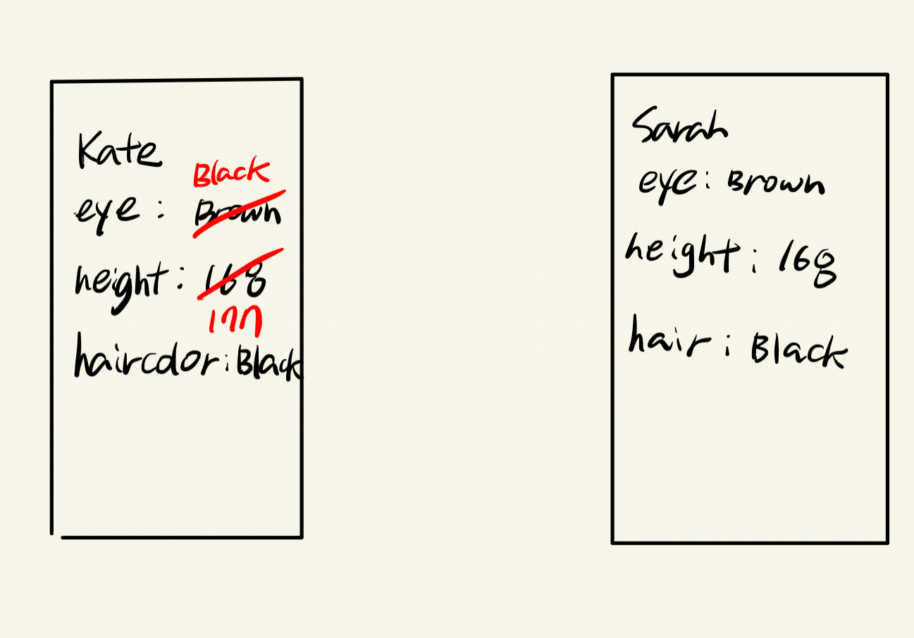 ์ฝ๋์์ผ๋ก ๋ดค์ ๋๋ ๋ถ๋ช kate์ ํ๋กํผํฐ๋ง ๋ณ๊ฒฝ์ด ๋์๋๋ฐ, ๊ฒฐ๊ณผ์ ์ผ๋ก ํธ์ถ๋ ๊ฐ์ ๋ณด๋ฉด sarah์ ํ๋กํผํฐ๋ ๋ณ๊ฒฝ๋ ๊ฒ์ ๋ณผ ์ ์์ต๋๋ค. ์ด๋ Class๋ ๋ฉ๋ชจ๋ฆฌ ์ฃผ์ ์ ๋ณด๊ฐ ์ ๋ฌ๋๋ ๋ฐฉ์์ด๊ธฐ ๋๋ฌธ์ ๊ฐ์ด ์ ์ฅ๋์ด ์๋ ๊ณณ์ ๊ณตํต์ผ๋ก ์ฌ์ฉํฉ๋๋ค. ๋ฐ๋ผ์ kate์ ํ๋กํผํฐ๋ง ๋ณ๊ฒฝํ์์๋, ์ด ํ๋กํผํฐ๋ค์ ๋ ๋ฆฝ์ ์ด์ง ์์ ๋ค๋ฅธ ๋ฉ๋ชจ๋ฆฌ์ ์ ์ฅ๋์ด sarah์ ๊ฐ์ ๋ฉ๋ชจ๋ฆฌ๋ฅผ ์ฌ์ฉํ๊ธฐ ๋๋ฌธ์ ์ต์ข ์ ์ผ๋ก๋ sarah์ ๊ฐ๋ ๋ณ๊ฒฝ๋ ๊ฒ์ ๋๋ค.