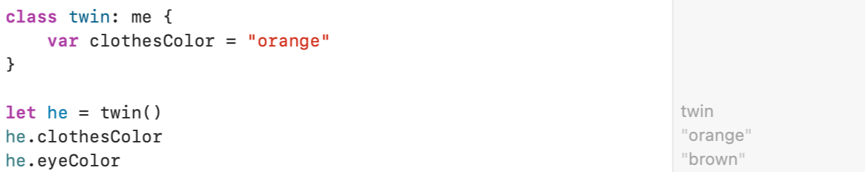 ์ด๋ ๊ฒ ํด๋์ค๋ ๋ค๋ฅธ ํด๋์ค๋ก๋ถํฐ ์์ฑ์ ์์๋ฐ์ ์๋ ์์ต๋๋ค. ์ด๋ twin ์ me ์ ์์ ํด๋์ค(SubClass) ๊ฐ ๋๊ณ , me๋ twin์ ๋ถ๋ชจ ํด๋์ค(SuperClass)๊ฐ ๋ฉ๋๋ค. ์์๋ฐ์ง ์๋ ํด๋์ค๋ ๊ธฐ๋ฐํด๋์ค(BaseClass)๊ฐ ๋ฉ๋๋ค. ๋ฐ๋ผ์ twin์ด๋ผ๋ ํด๋์ค๋ me๋ผ๋ ํด๋์ค๋ฅผ ๊ทธ๋๋ก ์์๋ฐ์, ๋๊ฐ์ ์์ฑ์ ๊ฐ์ง๋ฉด์ ์ถ๊ฐ๋ clothesColor๋ผ๋ ํ๋กํผํฐ๋ฅผ ๊ฐ์ง ๊ฐ์ฒด๊ฐ ๋ฉ๋๋ค.