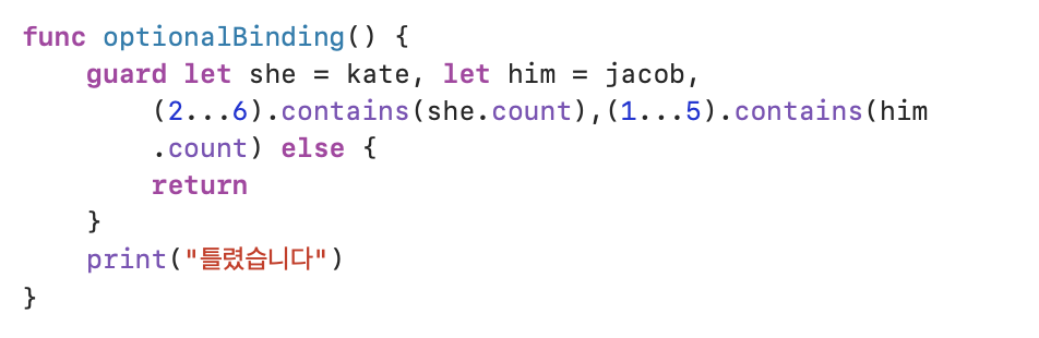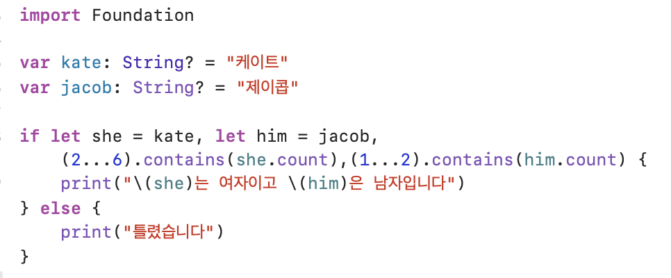์๋ Optional String ํ์ ์ด์๋ kate ์ jacob์ she ์ him ์ด๋ผ๋ ์๋ก์ด ๋ณ์(Type: String)์ ์ ์ฅํจ์ผ๋ก์จ, ์์ ํ๊ฒ Optional์ ์ฒ๋ฆฌํ์์ต๋๋ค. ๊ทธ๋ฆฌ๊ณ else ๊ตฌ๋ฌธ์ผ๋ก Optional์ด Nil๊ฐ์ ๊ฐ์ง ๋๋ฅผ ์ฒ๋ฆฌํด์ฃผ์์ต๋๋ค.