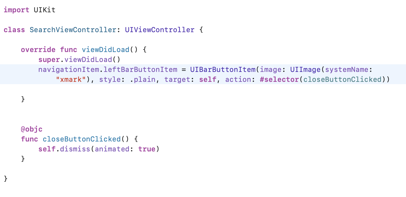 ๋ค์์ Dismiss ๊ตฌํ๋ฐฉ์์ ๋๋ค. ๋ซ๊ธฐ ๋ฒํผ์ selector๋ก ๋ฃ์ด์ฃผ๊ธฐ ์ํด, ๋ฐ๋ก closeButtonClicked()๋ผ๋ ๋ฉ์๋์ ์ฝ๋๋ฅผ ๋ฃ์ด์ฃผ์์ต๋๋ค. Dismiss๋ Present์ ๋นํด ๊ฐ๋จํ๊ฒ ์์ฑ๋ฉ๋๋ค.